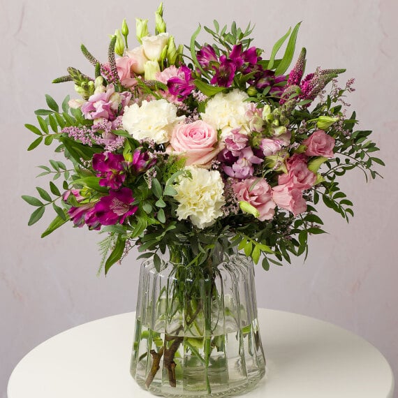Embrace the essence of a garden in bloom with the Florentina bouquet. The soft Avalanche Rose and cream Carnations contrast beautifully with the striking purple Alstroemeria. Graceful stems of Veronica, combined with Snapdragon add volume to the bouquet while lush foliage adds the perfect finishing touch.