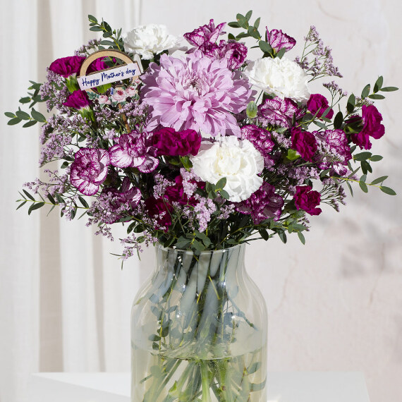 Celebrate Mum with a stunning arrangement of luxurious purple and white Carnations beautifully paired with delicate Limonium. Long-lasting and vibrant, this bouquet creates a showstopping display that Mum will treasure. Sent with a keepsake decorative wooden ‘Happy Mother’s Day’ pick.