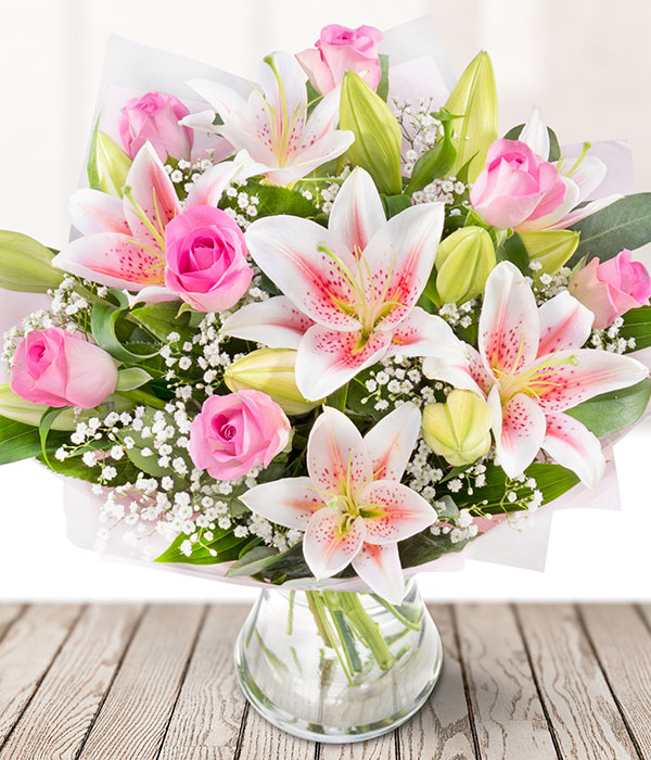 A stunning bouquet in which fragrant lilies stretch their star-like petals out amongst pink roses and gypsophila, creating a graceful mixture of delicate blooms. Sent in a protective Eflorist box, it arrives safely and offers a delightful unboxing experience. Your super-fresh flowers will arrive in bud, ready to transform in front of your lucky recipient within 48 hours from delivery, all with tracked delivery and nationwide coverage giving you peace of mind. With its exceptional beauty and unbeatable price, this bouquet is the perfect choice to brighten someone’s day.