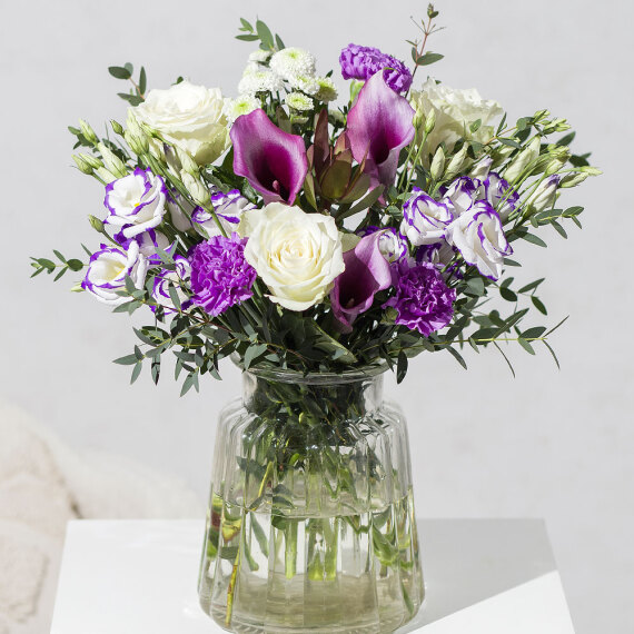An exquisite collection of elegant Calla Lilies and vibrant purple blooms. This luxurious bouquet showcases striking Calla Lilies paired with rich purple Carnations, delicate Lisianthus stems and pure white Athena Roses, complemented by lush greenery. Please note colour of Calla Lily may vary slightly from image.