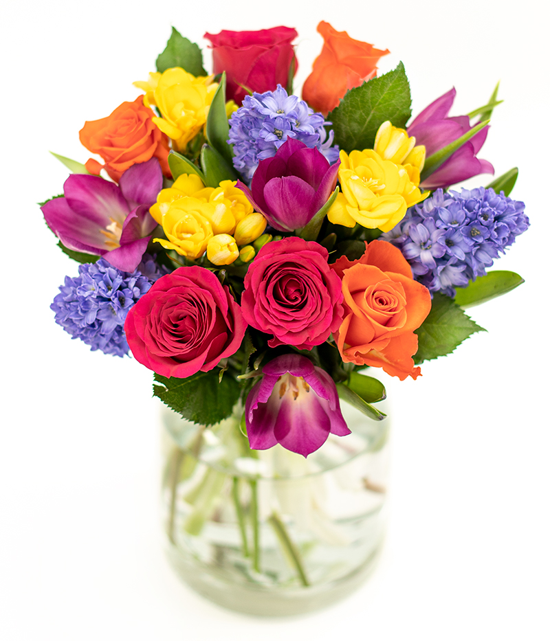The epitome of spring. Hot pinks mingled with yellow freesia, fragrant blue hyacinth, tulips, and orange roses, creating a stunning, yet inexpensive arrangement that’s sure to impress. Witness the miracle of nature unfolding in your vase as these flowers arrive in bud, ready to enchant the recipient by opening up within 2 days after delivery. Delivered in a special Eflorist box, this bouquet promises a delightful unboxing experience for your loved one.